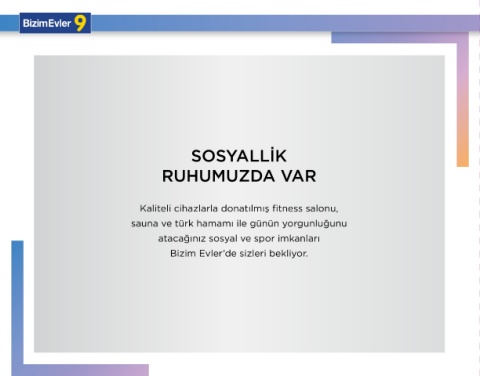 bizim e vler . com. tr 35 SOSYALLİK RUHUMUZDA VAR Kaliteli cihazlarla donatılmış fitness salonu, sauna ve türk hamamı ile günün yorgunluğunu atacağınız sosyal ve spor imkanları Bizim Evler’de sizleri bekliyor.