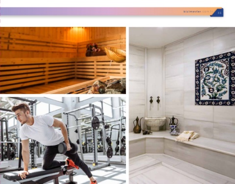 bizim e vler . com. tr 35 SOSYALLİK RUHUMUZDA VAR Kaliteli cihazlarla donatılmış fitness salonu, sauna ve türk hamamı ile günün yorgunluğunu atacağınız sosyal ve spor imkanları Bizim Evler’de sizleri bekliyor.