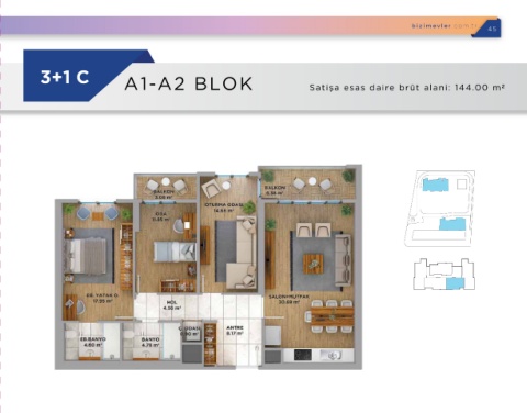 3+1 A A1-A2 BLOK Satişa esas daire brüt alani: 174.00 m2 3+1 C A1-A2 BLOK Satişa esas daire brüt alani: 144.00 m2